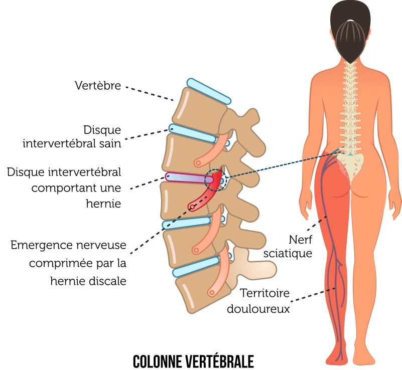 Hernie discale : L’irritation du nerf sciatique par un disque est une des causes les plus fréquentes.