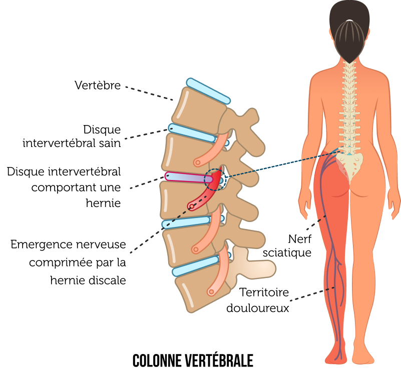 Hernie discale : L’irritation du nerf sciatique par un disque est une des causes les plus fréquentes.