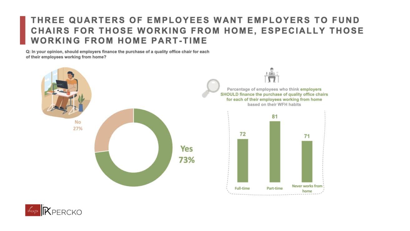 Three-quarters of employees (73%) want their employers to finance quality chairs for those working from home. This point is particularly salient amongst those working from home part-time (81%), senior or executive management (79%), and the upper class (80%).