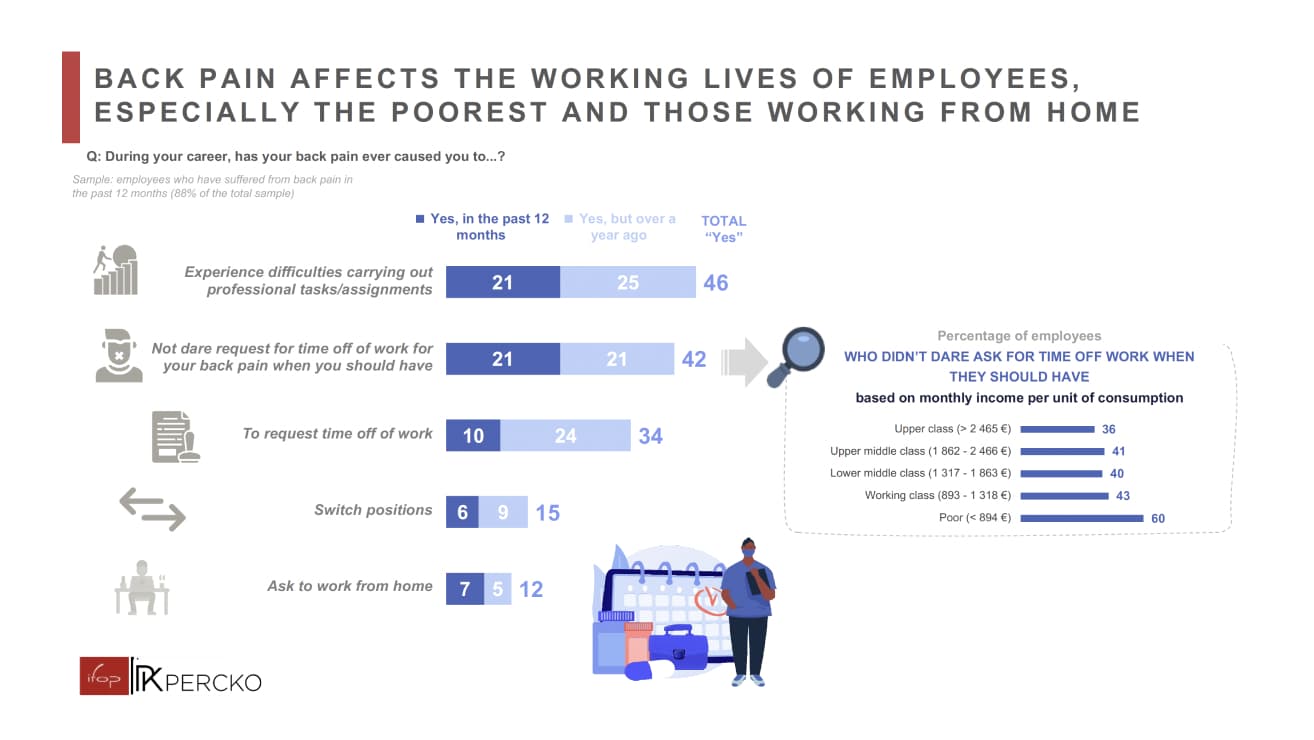 The suffering caused by back pain is dismissed with such frequency that it has almost become a taboo subject: the proportion of employees who don’t dare ask for time off work because of back pain when they should have (42%) is higher than the proportion (34%) of those who dared speak up and ask for time off. Those in precarious financial situations are the least likely to ask for time off because of back pain when they should: the majority (60%) of poor workers who have suffered from back pain in the past 12 months have already failed to do so.