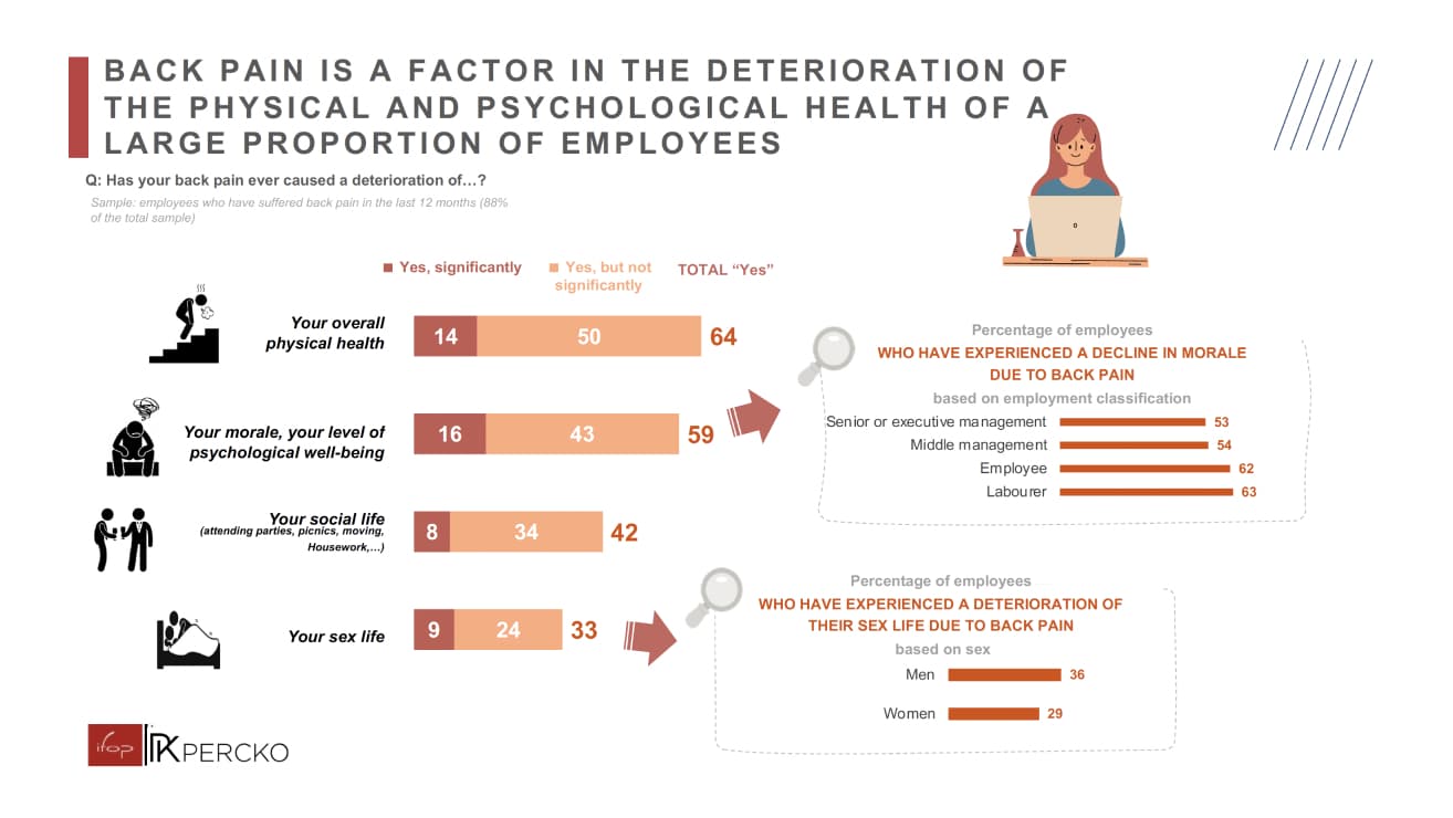 Beyond work, back pain is also reported as a factor in the deterioration of physical (64% of those affected by back pain) and mental (59%) health of a large proportion of employees. It specifically affects the social lives (42%) and sexual habits (33%, including 36% among men) of a significant proportion of employees.