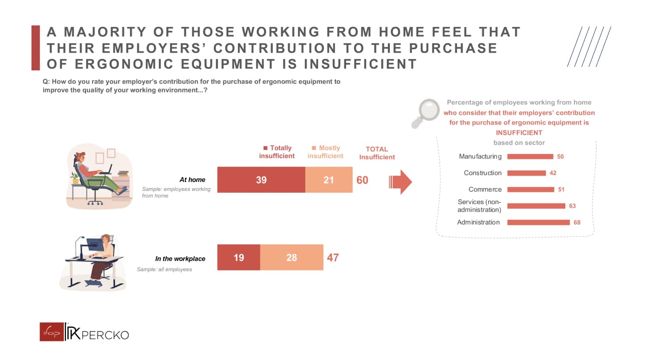 A majority of those working from home consider their company's contribution to the purchase of ergonomic equipment to be insufficient (60%). This number drops amongst employees who don’t work from home, with 47% unsatisfied with the purchasing of ergonomic material.