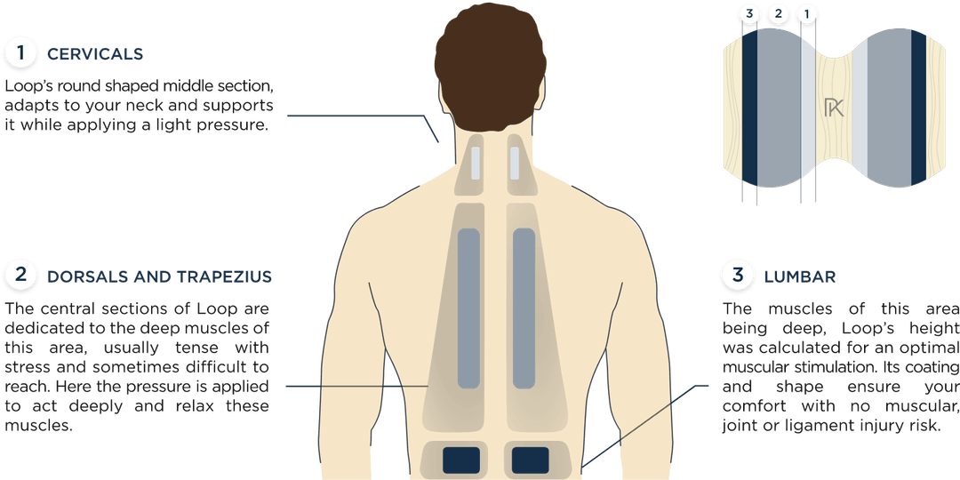 The central sections of Loop are dedicated to the deep muscles of this aera, usually tense with stress and sometimes difficult to reach. Here the pressure is applied to act deeply and relax these muscles.